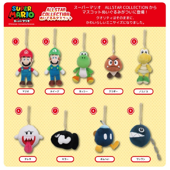 It’s-a plushie mascots of all the awesome characters you love seeing when you play Super Mario All-Stars! Made by San-Ei, each soft plush comes with a mini chain attached. Choose from Mario, Luigi, Yoshi, Goomba, Koopa Troopa, Boo, Bullet Bill, Bob-omb, or Chomp!
